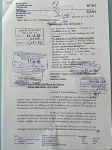 Dans une correspondance adressée au Procureur Général près la Cour de Cassation, l’Association Congolaise pour l’accès à la justice (ACAJ), plaide pour la clôture ou le classement sans suite de l’enquête judiciaire déclenchée à charge de 19 candidats dont les suffrages ont été invalidés par la Commission Électorale Nationale Indépendante.