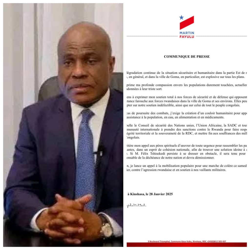 Dans un communiqué rendu public la nuit du lundi à mardi 28 janvier 2025, l’opposant Martin Fayulu hausse le ton contre l’occupation rwandaise marquée par la détérioration de la situation sécuritaire au Nord-Kivu, les pillages des ressources minières, les viols des femmes et les tueries.